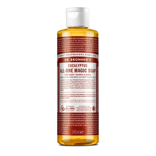 Mydło eukaliptusowe zamieni każdą łazienkę w spa. Ponieważ typowy zapach eukaliptusa rozprzestrzenia się w ciągu kilku minut dając przyjemne uczucie regeneracji i relaksu. Dodatkowo niezależnie, od przyjemnie korzennego zapachu, olejek eukaliptusowy sprawia, że całe wellness działa, ponieważ otwiera pory i oczyszcza skórę oraz zatoki przynosowe otaczając ciało ciepłymi oparami. Naturalne mydło w płynie 18 w 1 zawiera kompozycję organicznych olejków kokosowego, oliwkowego, z ziaren palmowych, konopnego i jojoba. Mydło Dr. Bronner's to najczystsze składniki organiczne z certyfikowanych upraw ekologicznych i z certyfikatem Sprawiedliwego Handlu. Wegańskie, biodegradowalne, bezpieczne dla ludzi, zwierząt i środowiska. Opakowanie pochodzi w 100% z recyklingu pokonsumenckiego PCR. 18 w 1 oznacza wszechstronne zastosowanie. Nasze mydła 18 w 1 są potrójnie skoncentrowane, wystarczy kilka kropel!