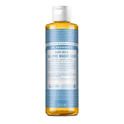 Mydło bezzapachowe z podwójną ilością oliwy z oliwek, idealne dla wrażliwej skóry dzieci i niemowląt jak również dla alergików i wszystkich, których skóra wymaga szczególnej pielęgnacji. Naturalne mydło w płynie 18 w 1 zawiera kompozycję organicznych olejków kokosowego, oliwkowego, z ziaren palmowych, konopnego i jojoba. Mydło Dr. Bronner's to najczystsze składniki organiczne z certyfikowanych upraw ekologicznych i z certyfikatem Sprawiedliwego Handlu. Wegańskie, biodegradowalne, bezpieczne dla ludzi, zwierząt i środowiska. Opakowanie pochodzi w 100% z recyklingu pokonsumenckiego PCR. 18 w 1 oznacza wszechstronne zastosowanie. Nasze mydła 18 w 1 są potrójnie skoncentrowane, wystarczy kilka kropel !