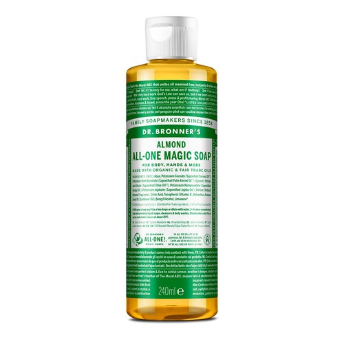 Cudowne ciepło, pocieszające i lekko słodkie – jak marcepan czy amaretto! Jednocześnie bardzo świeży, przypominający marcepan, rozgrzewa, pociesza i uspokaja. Naturalne mydło w płynie 18 w 1 zawiera kompozycję organicznych olejków kokosowego, oliwkowego, z ziaren palmowych, konopnego i jojoba. Mydło Dr. Bronner's to najczystsze składniki organiczne z certyfikowanych upraw ekologicznych i z certyfikatem Sprawiedliwego Handlu. Wegańskie, biodegradowalne, bezpieczne dla ludzi, zwierząt i środowiska. Opakowanie pochodzi w 100% z recyklingu pokonsumenckiego PCR. 18 w 1 oznacza wszechstronne zastosowanie. Nasze mydła 18 w 1 są potrójnie skoncentrowane, wystarczy kilka kropel!