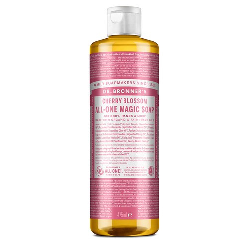 Naturalne mydło w płynie 18 w 1 zawiera kompozycję organicznych olejków: kokosowego, oliwkowego, z ziaren palmowych, konopnego i jojoba i zostało uszlachetnione naturalnym aromatem kwiatu wiśni. Dzięki temu możesz cieszyć się zapachem kwiatów wiśni przez cały rok. Mydło Dr. Bronner's to najczystsze składniki organiczne z certyfikowanych upraw ekologicznych i z certyfikatem Sprawiedliwego Handlu. Wegańskie, biodegradowalne, bezpieczne dla ludzi, zwierząt i środowiska. Opakowanie pochodzi w 100% z recyklingu pokonsumenckiego PCR. 18 w 1 oznacza wszechstronne zastosowanie. Nasze mydła 18 w 1 są potrójnie skoncentrowane, wystarczy kilka kropel !